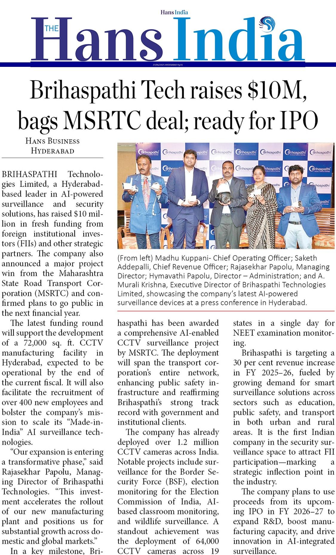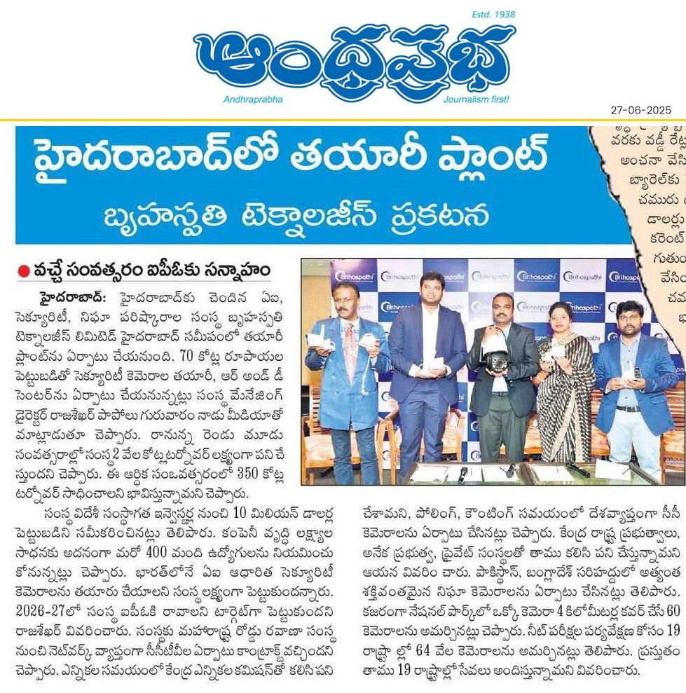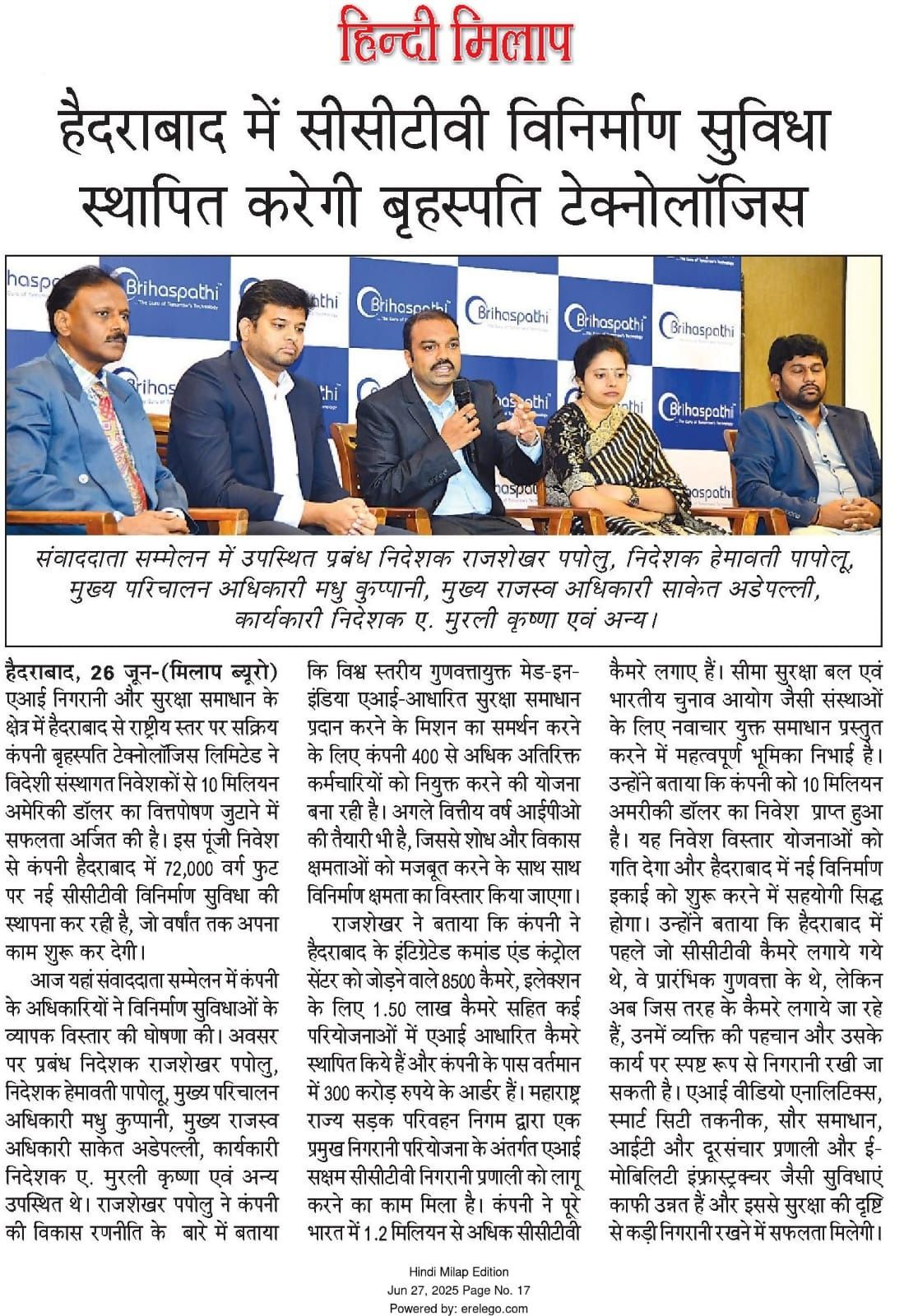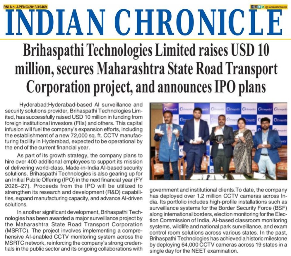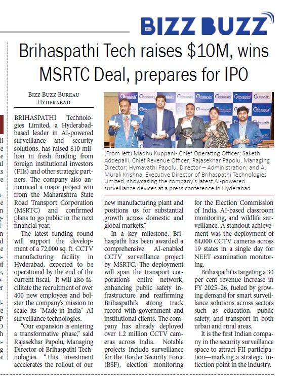 Brihaspathi Technologies has been widely featured across leading national and regional newspapers for its achievements in technology innovation, manufacturing expansion, funding milestones, and large-scale government projects.