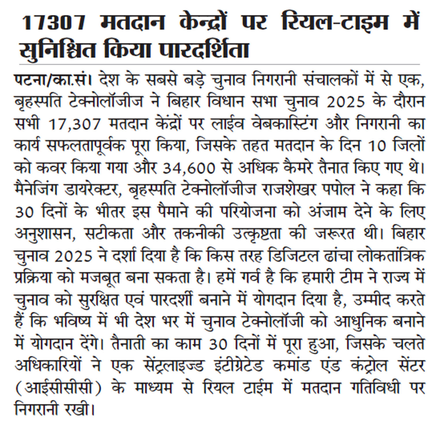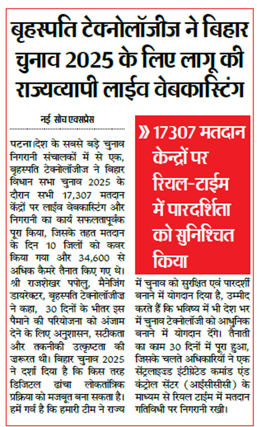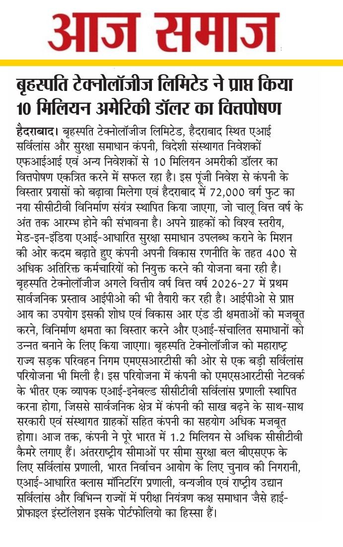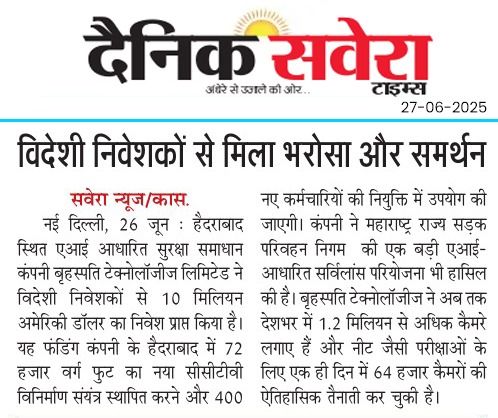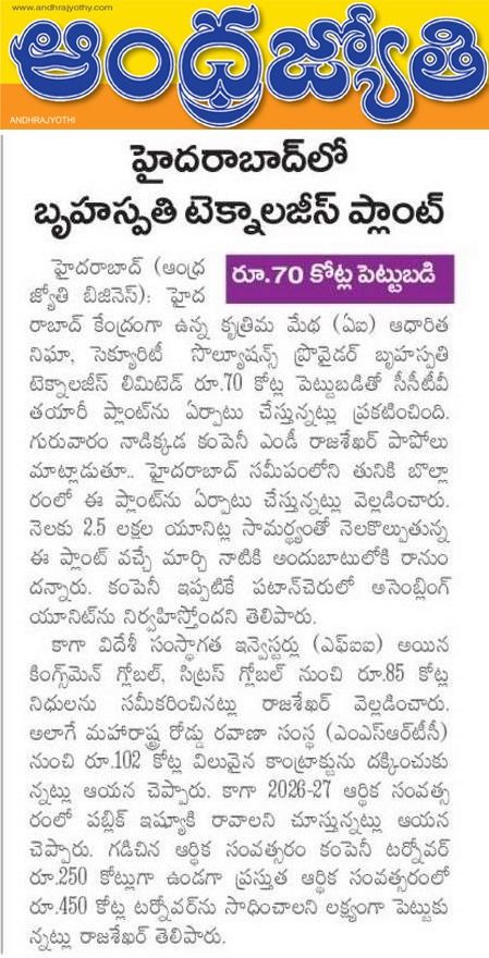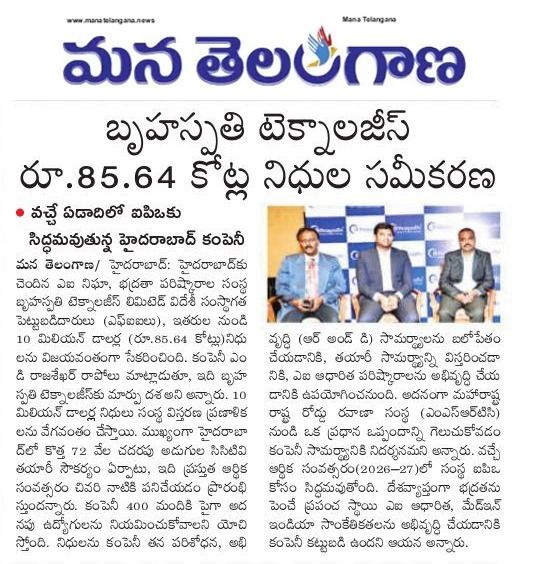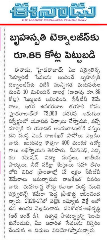 Brihaspathi Technologies has been widely featured across leading national and regional newspapers for its achievements in technology innovation, manufacturing expansion, funding milestones, and large-scale government projects.